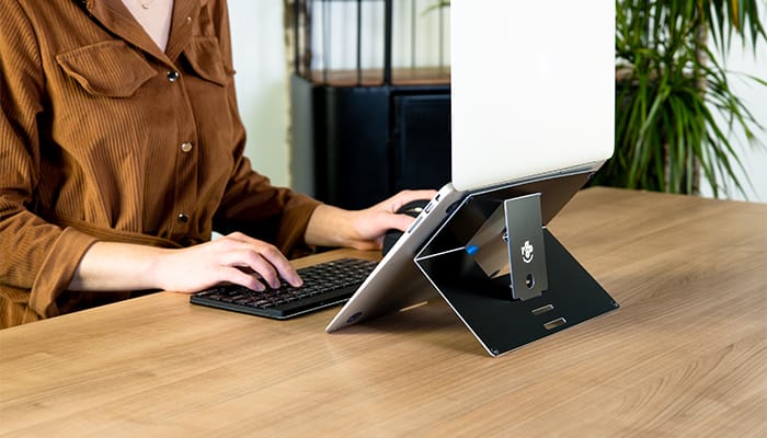 Denna standard för bärbara datorer är enkel i 4 höjder. Så jobbar du alltid på ögonhöjden och förhindrar att du har en gebogen arbetshållning och besvär i nek och matta. Det är bekvämt att använda på kontoret, hemma på vägen. Så står huvudet i en naturlig ställning och minskar spännvidden i je nek- och schouderspieren.