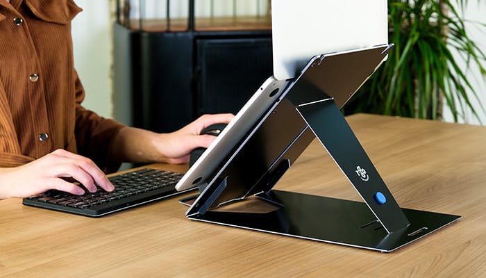 Med stativet R-Go Riser Duo för laptop och surfplatta kan du höja både din laptop och surfplatta. Stativet är enkelt justerbart i fyra lägen, så att du alltid kan arbeta i ögonhöjd. Detta höjer ditt huvud naturligt och minskar spänningar i dina nack- och axelmuskler. R-Go Riser Duo är ultratunn och lätt: perfekt att bära i väskan!